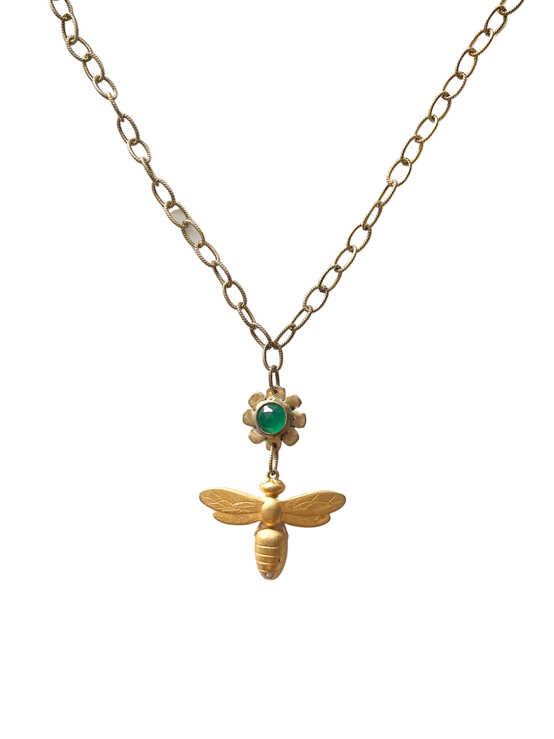 Buzz Necklace: Vintage Bee Charm + Green Onyx + Brass • 14"